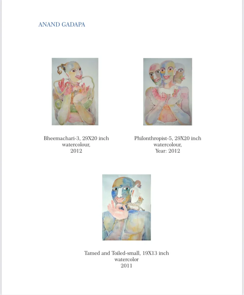 Formalistically, the composition of figures, inspired/borrowed from ‘traditional’ imagery,demonstrates the aesthetic/visual pleasure, where as conceptually they are not mere human figures but carriers of ambiguous meanings. Gadapa deliberately makes an attempt to show the ambiguity using metaphoric rudiments, gestures, and the formulation of visual vocabulary to obscure the artist’s intentionality. There is an effort to exploit ‘symbols’ that could share/generate multiple meanings. In fact, he would like to stimulate the viewer’s frame of mind and wish to create a reality in which the viewer can live in. Here the language itselfbecomes ‘unknown’ or ‘the other’, though it holds deeper meaning. According him, the ‘cognition’ could only be possible by ‘propositional knowledge’.