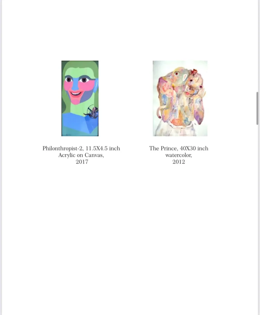The female protagonist, replicating her ‘self’, remains central in Nirmala Biluka’s “trancetemporal space”. She is a performer as well as an observer/witness; watching things happeningaround her. The ‘images’ around her do not remain hushed but start narrating and weaving stories. They often become ‘floating signifiers’ and ‘metaphors’ of the hidden consciousness.She made an attempt to amalgamate the metaphysical aspect of Indian painting and her personal choice of femininity, which is conceived metaphorically & philosophically as Shakti energy or prakriti (nature). For instance, in ‘Vasanta Raaga’, the protagonist is a personification of the myth of nature. The continuous metamorphosis of birth, growth & decline stands as anultimate truth inviting the spring season with all its rejuvenating omnipotence.Priti Samyukta Priti Samyukta’s self depictions redefine femininity bringing everything into the space with nquisitiveness. Her works appear to be autobiographical, lyrical and cling to the ‘traditional’roots that can be seen profoundly, as her ‘collective memory’ is deciphered deliberately within the contours of the image and the imagery that is derived from her house hold things such as old pillow covers. Her nostalgic opus, inspired from oriental zest, against a multi-layered back ground, sings the lullaby of the past and the celebration of present as she affirms, ‘journey is more important than the destination’.