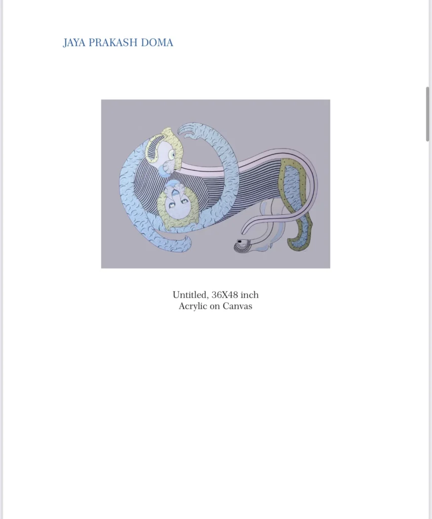 Jaya Prakash Doma Jaya Prakash selectively picks up an interesting fictional imagery of wild animal akin to the ancient Chimera. He believes that making art is a reflection of nature as well as society thus the metaphoric Chimera occupies his canvases to produce multiple meanings. Jaya Prakash makes an attempt retouch/re-present the mythical animal with utmost crafty skills as if the drawing wins over the conventional painting. A careful rendering of the surfaces with Black& White and colour is seen his paintings. His idea of flaccid animal is here to describe both the social inactiveness and representation of an imaginative or implausible animal instinct.