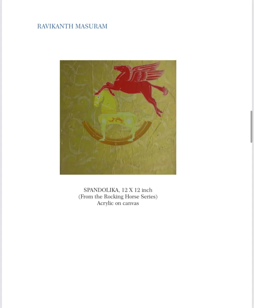 Swinging back and forth Masuram Ravikanth, a promising artist, re-discovers his Spandolika, aplay toy from his childhood, while searching for an innovative visual vocabulary. (The Sanskrit word spandolika means ‘rocking one’s self to and fro’). The artist’s enthralling artworks may be termed as his nostalgic renditions of bygone days. These ‘play-toys’ are not mere re- presentations of the bygone era but a deliberate effort to re-contextualize the ‘spandolika’ itself. The metaphors are none other than his childhood belongings which take shape of ‘objects of curiosity’, as the gifted artist successfully captures the ambiguity and effervescent quality of the ‘spandolika’.